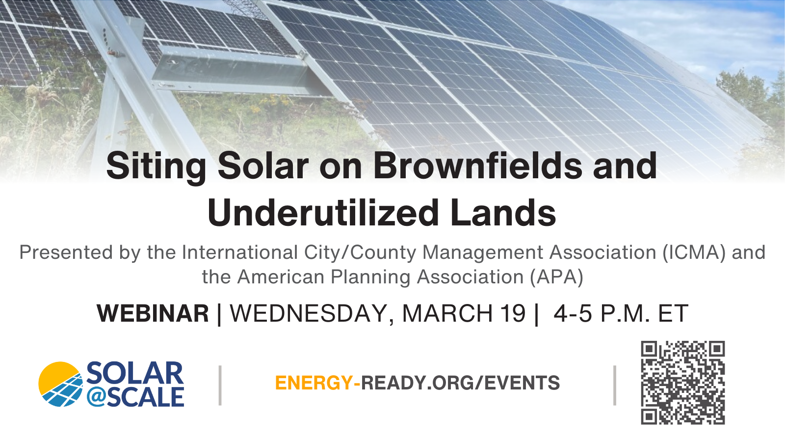 Many, if not all, communities have properties sitting vacant due to a history (or perceived risk) of contamination. These “brownfield” sites can be excellent candidates for solar development, but they can also present unique challenges. Join us on Wednesday, March 19th, from 4-5 p.m. ET for Siting Solar on Brownfields and Underutilized Lands. Hosted by the International City/County Management Association (ICMA) and the American Planning Association (APA) Solar@Scale team, this webinar explores how brownfields and underutilized lands can be good options for solar developments that create economic value and benefit the surrounding community. This webinar will feature a background on the challenges and opportunities these lands present, share landowner and solar developer perspectives, and provide guidance on how to get started. Join us to learn more!